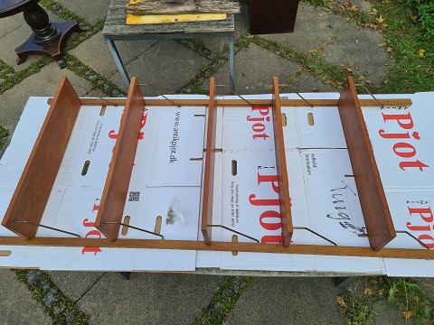 Reol til ophængning på væggen fra 1960'erne i finéret teak. Består 5 hylder á 80 x 20 cm. og 2 vanger á 198 cm. Pænt og ok velholdt dog med lidt brugsspor i form af overflade skrammer og uoriginale skruer. (Billede)