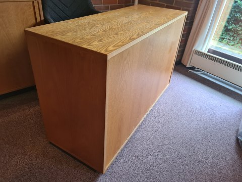 Arkivskab fra 1980'erne i finéret eg med jalousi låge. Fremstår pænt og velholdt, dog med lettere brugsspor på toppen. (Billeder) Forskellige indretningsformer haves. Fungerende nøgle medfølger.