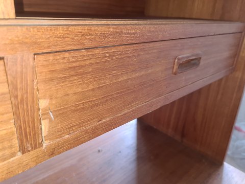 Dobbelt skænk fra 1960'erne i teakfinér. Fremstår pæn og ok velholdt, dog med manglende hylde nederst til højre og enkelte finér skader. (Billede)