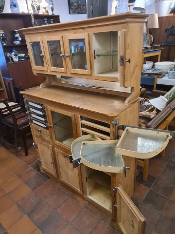 Ældre originalt tandlægeskab i fyrretræ med låger og hylder i glas og metal.